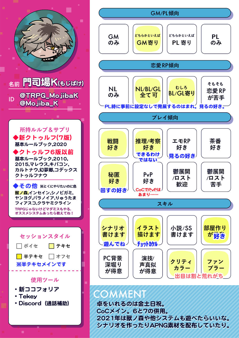 KP時のセッションツールはココフォリア7割・Tekey3割。ばりばり秘匿シナリオの際はTekey利用にご協力ください。